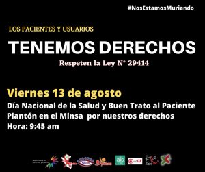 Hoy a partir de las 9:45 de la mañana realizarán un plantón pacífico en el frontis del Ministerio de Salud, en protesta por el incumplimiento de los cinco principales derechos que contempla la Ley N° 29414, ley que protege los derechos de los pacientes y usuarios.