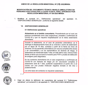 Es importante resaltar que en la Resolución Ministerial también informa que los familiares de personas que tengan un diagnostico positivo o sean un caso sospechoso y no cuenten con vacunación completa también deberán cumplir con el aislamiento de 7 días, sin embargo este puede reducirse a 5 en el caso de que se cuente con una prueba negativa.