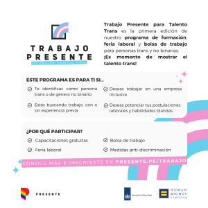 Lima – Perú.- Una luz de esperanza. Con el fin de alcanzar una plaza laboral y facilitar el acceso a un trabajo digno donde se respeten sus derechos, la ONG Presente, lanza Trabajo Presente, un programa gratuito, de empleabilidad y bolsa de trabajo para personas trans y no binarias.