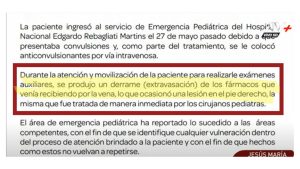 A raíz de la denuncia EsSalud emitió un comunicado donde indican que a la menor se le aplicaron anticonvulsionantes (fármacos) vía intravenosa, y durante la movilización de la misma es que habría ocurrido «el derrame», ocasionando el daño, pero lo que no han comunicado es quién o quienes son los responsables de lo sucedido.