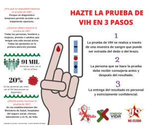 Indicó que aquellos resultados que salgan reactivos (positivos), la institución cuenta con vinculadores, para que las personas puedan acceder a los servicios médicos en los hospitales del Ministerio de Salud, EsSalud o cualquier otro establecimiento que brinde Tratamiento Antirretroviral -TAR.