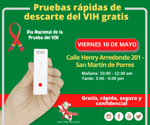Las personas que deseen realizarse una prueba gratuita de VIH deberán acudir desde las 10 de la mañana a las 12:30 del mediodía y de 3 a 5 de la tarde a las oficinas de Sí, da Vida, ubicadas en la calle Henry Arredondo 201- en el distrito de San Martín de Porres, a una cuadra del paradero Honorio Delgado del Metropolitano.