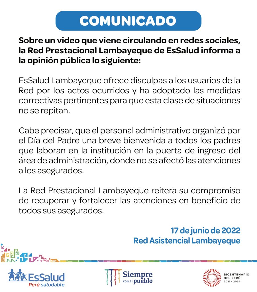 Ante el hecho la Red de prestación de Salud Lambayeque de EsSalud se pronunció, y ofreció unas disculpas por los actos ocurridos.