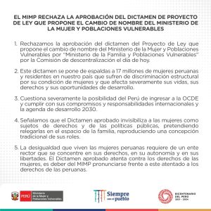 La desigualdad que viven las mujeres peruanas requiere de un ente rector que se concentre en sus derechos, en su autonomía y en sus libertades. El dictamen aprobado atenta contra los derechos de las mujeres, es deber del MIMP pronunciarse frente a este atentado a los derechos de las peruanas” se desprende del documento.