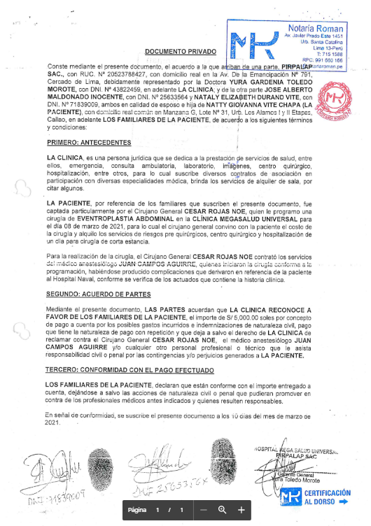 Nataly denuncia que ante su desesperación acudió a la Clínica Megasalud, donde firmó un documento que la clínica presentó para poder desligarse económicamente del caso de su madre.
