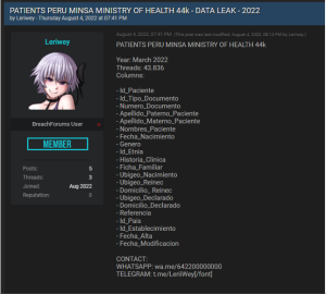 De acuerdo al foro, en la base de datos se ofertaba información sensible de los pacientes del Minsa como, nombres completos, documentos de identidad, historial clínico, dirección entre otros.