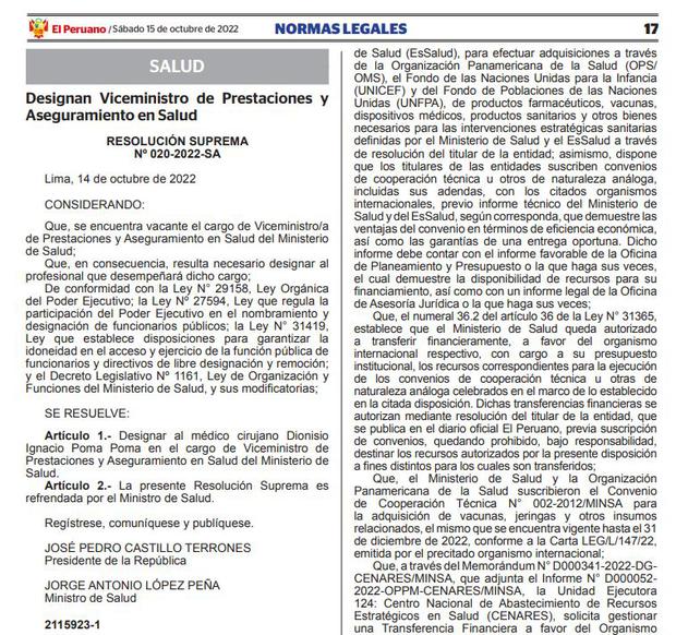La Resolución Suprema 020-2022-SA, suscrita por el Presidente Pedro Castillo y el Ministro de Salud Jorge López, tiene como reunión 14 de octubre y fue publicado este sábado en el Boletín de Normas Jurídicas de un peruano