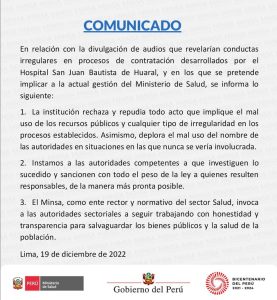 Por su parte, el Ministerio de Salud emitió un comunicado a la opinión pública rechazando y repudiando cualquier tipo de irregularidad que involucre la actual gestión en el Minsa.