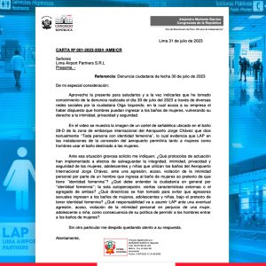 Lima, Perú.- Juegan en pared. Olga Izquierdo, ciudadana que denunció que en los servicios higiénicos del Aeropuerto Internacional Jorge Chávez, permitan el ingreso de “toda persona con identidad femenina”, es una mujer ligada al parlamentario ultra conservador Alejandro Muñante, por la que su actuación transfóbica sería una campaña contra los derechos de las personas TLGBIQ+ en el país.