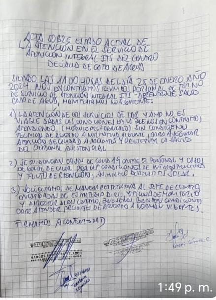 Radio Conexión Vida, tuvo acceso a un documento donde el mismo personal médico solicita mejores condiciones para poder ejercer sus funciones. Señalan que no se les brinda las condiciones técnicas establecidas en la norma vigente de atención a PVVS. Además d denunciar que el personal médico asistencial sufrió de golpes de calor, debido a las altas temperaturas.