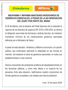 Por su parte, las líneas de boticas Inkafarma y Mifarma comunicaron que aún mantienen vigente dicha norma en todos sus locales en todo el país con inventarios de medicamentos genéricos esenciales y señalaron en su comunicado, su compromiso por la población afectada ante el desabastecimiento en farmacias públicas.