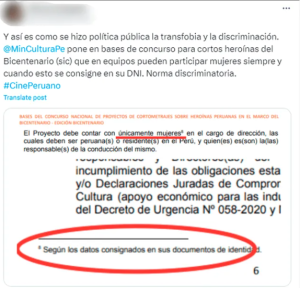 De acuerdo con lo publicado por una usuaria a través de X, la cartera de Cultura, liderada por la ministra Leslie Urteaga, se está cometiendo una falta discriminatoria al no permitir la participación de mujeres trans, tal y como lo indica en el punto 5.2 de los parámetros de esta competición audiovisual.