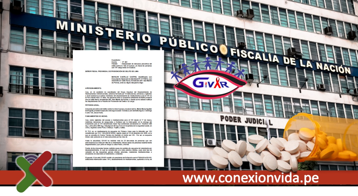 Lima – Perú.- Este martes el colectivo GIVAR denunció por el presunto delito contra la vida, el cuerpo y la salud a la Presidenta Ejecutiva de EsSalud, la Dra.María Elena Aguilar Del Águila , ante los desabastecimientos de medicamentos para el VIH en la seguridad social ante la Cuarta Fiscalía de Prevención del Delito de Lima, que recepcionó la acción judicial.