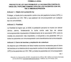 El Congreso propone ley que busca promover la vacunación contra el virus del papiloma humano (VPH) en personas con VIH y tuberculosis. Esta iniciativa tiene como objetivo reducir la incidencia de cáncer cervical y otras enfermedades relacionadas con el VPH en poblaciones vulnerables.