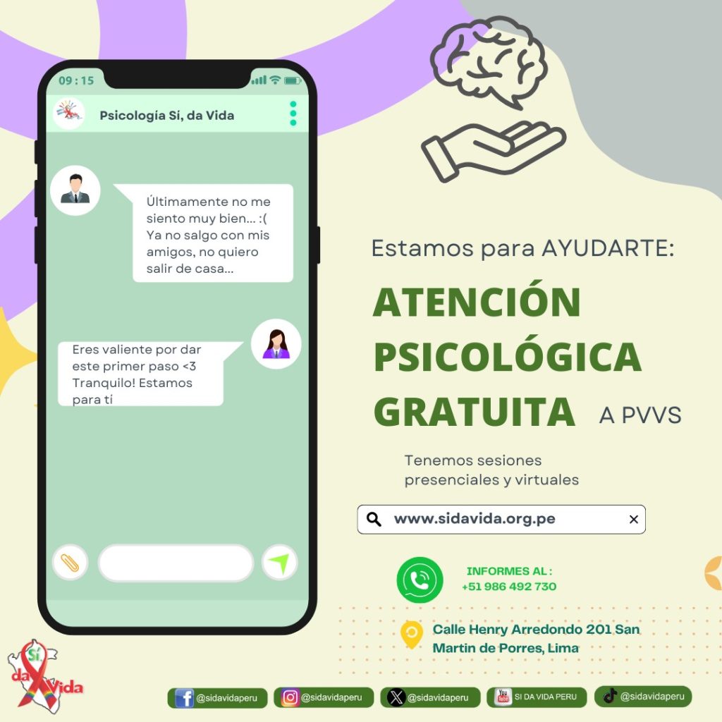No enfrentes estos desafíos en soledad. Rodearte de una red de apoyo, ya sea a través de amigos, familiares o grupos comunitarios, puede marcar una gran diferencia en tu bienestar emocional. En nuestra ONG SI,DA VIDA , ofrecemos un servicio gratuito de psicología dirigido especialmente a PVVS. Contáctanos al +51 986 492 730 y da el primer paso hacia un mejor bienestar emocional y calidad de vida.
