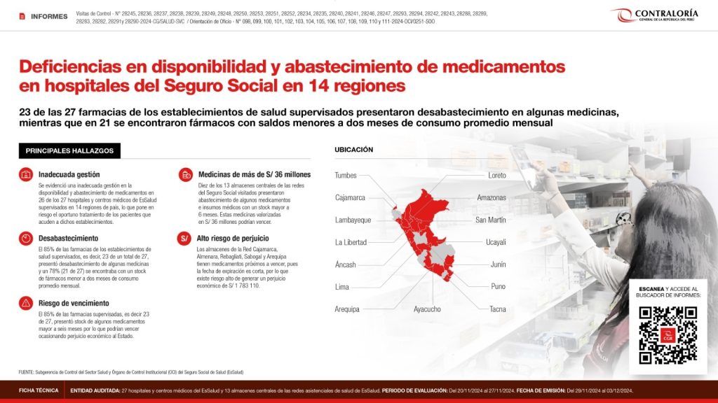 Paralelamente, el informe también identificó que en 10 de los 13 almacenes centrales supervisados, algunos medicamentos tienen un stock mayor a seis meses, lo que podría ocasionar vencimientos y un perjuicio económico al Estado estimado en más de S/. 36 millones. Almacenes como los de las redes asistenciales de Cajamarca, Almenara y Rebagliati contienen medicamentos próximas a caducar, incrementando el riesgo de pérdidas económicas.