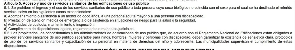 El artículo 5 de la ley señala que solo podrán acceder a los baños públicos las personas cuyo “sexo biológico” coincida con el que ha sido asignado al espacio sanitario. Solo se contemplan excepciones para casos de emergencia médica, acompañamiento a personas con discapacidad, mantenimiento o cumplimiento de disposiciones legales.