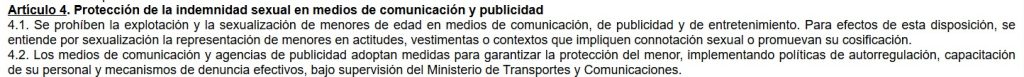 La ley también establece restricciones al contenido mediático y publicitario, prohibiendo la sexualización de menores. Ordena que medios y agencias adopten medidas de autorregulación, capacitación y canales de denuncia. Si bien esto es positivo en principio, queda la duda de cómo se interpretará y aplicará esta medida y si no se usará para censurar contenido diverso o educativo con enfoque de género o diversidad sexual.