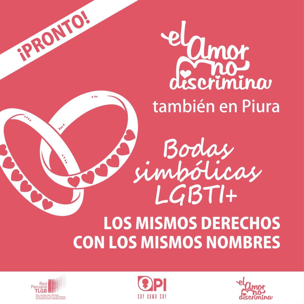 Lima – Perú.- La Organización por la Igualdad “Soy como Soy” (OPI: SCS) y la Red Peruana TLGB realizarán este sábado 17 de mayo, desde las 6 de la tarde, las primeras bodas simbólicas de personas LGBTIQ+ en un espacio público de Piura. El evento tendrá lugar en la Concha Acústica de la ciudad, donde habrá también un espectáculo artístico para celebrar la diversidad y el amor en todas sus formas.