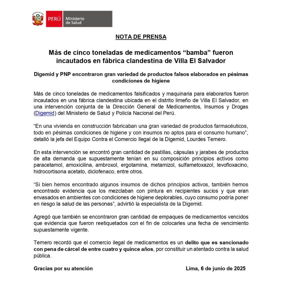 Lima, Perú. – En un operativo conjunto realizado por la Policía Nacional del Perú (PNP) y la Dirección General de Medicamentos, Insumos y Drogas (Digemid), se incautaron más de cinco toneladas de medicamentos adulterados y productos farmacéuticos sin registro sanitario en una vivienda en construcción en el distrito de Villa El Salvador, al sur de Lima Metropolitana.