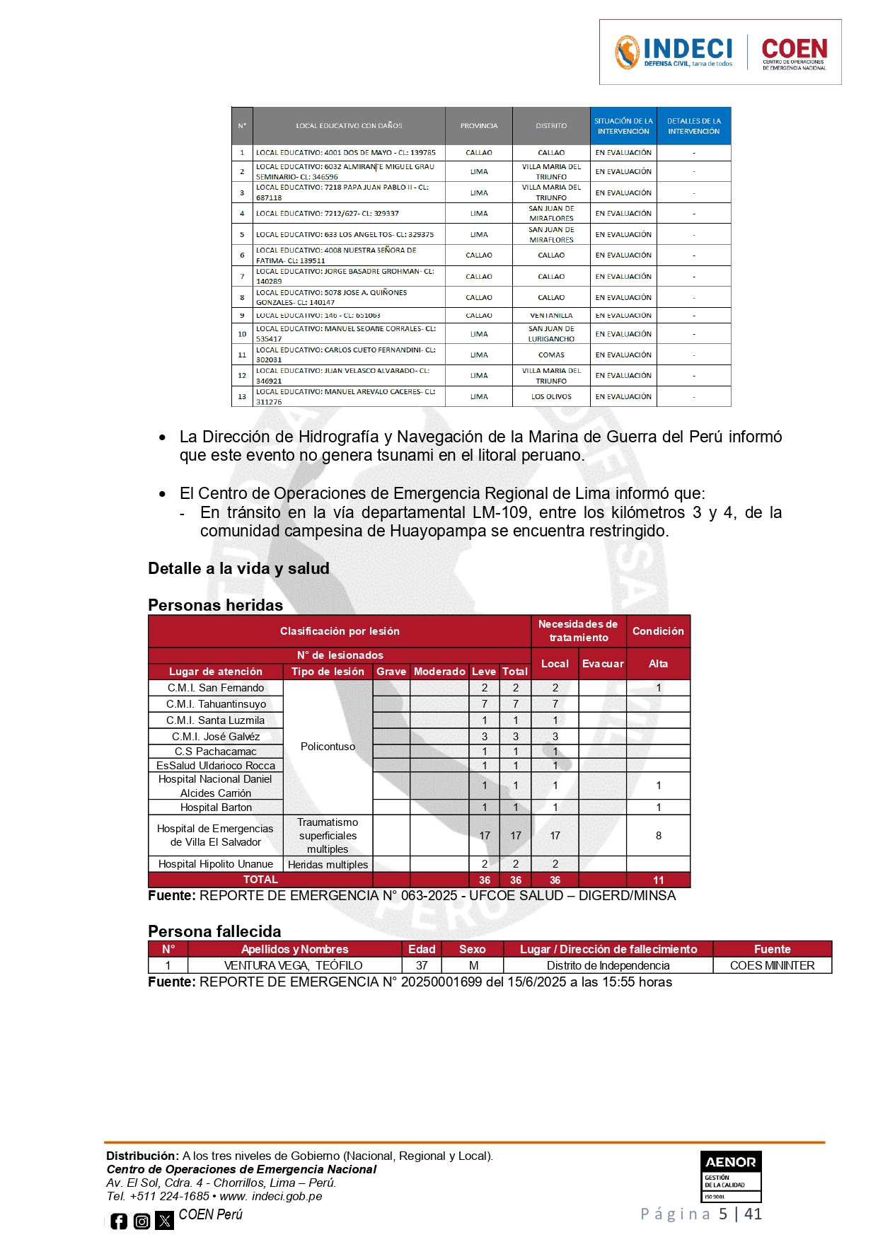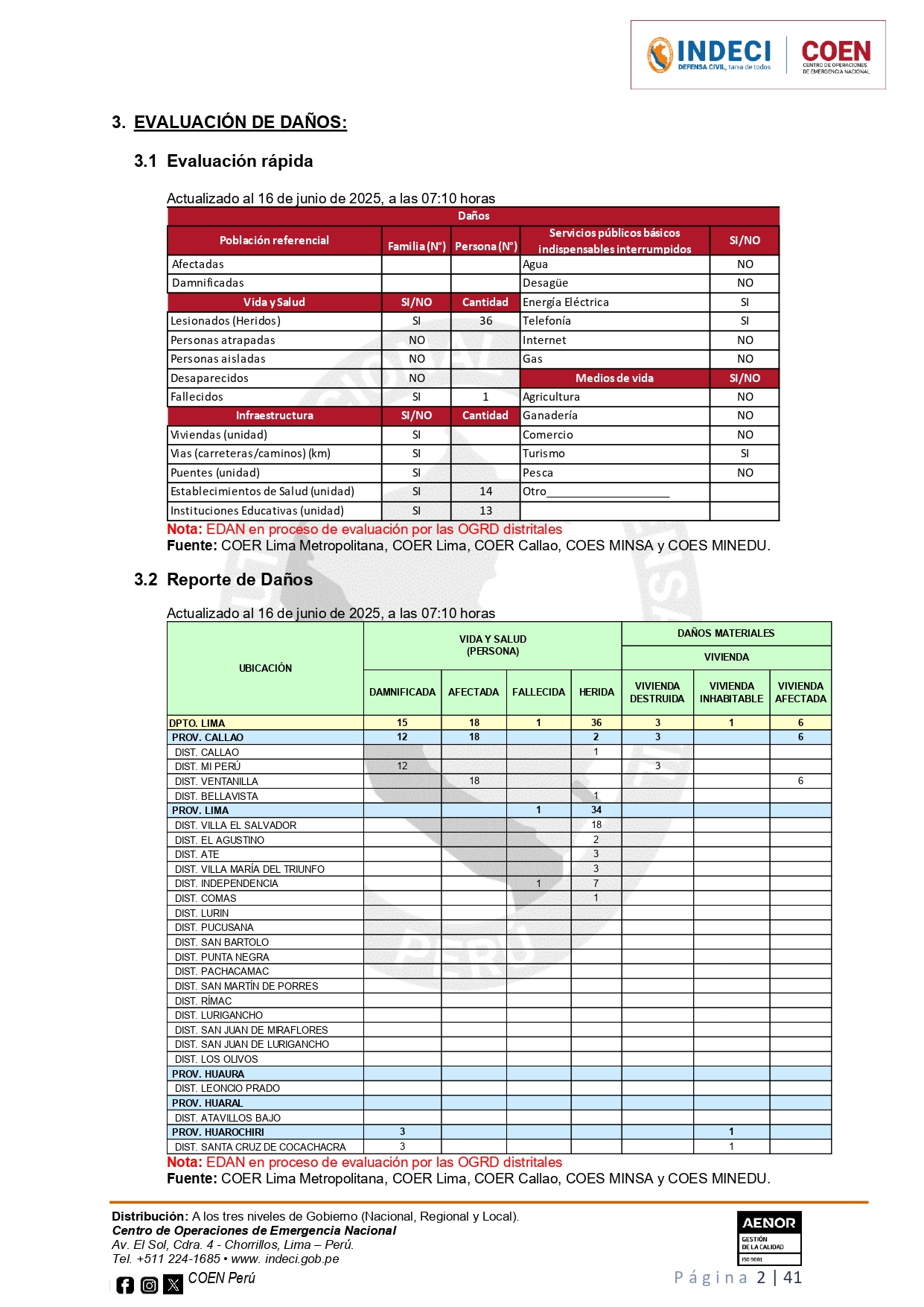 REPORTE COMPLEMENTARIO N.º 6630 – 16/6/2025 / COEN-INDECI / 07:10 HORAS