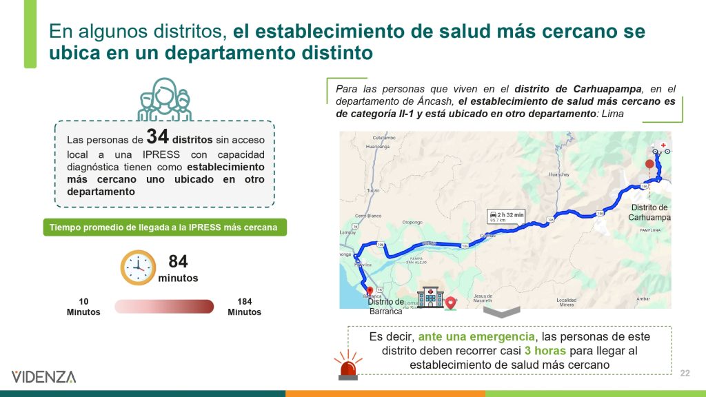 El estudio, difundido en junio, identificó a 43 distritos rurales donde el acceso a establecimientos de salud con capacidad diagnóstica, como los centros de nivel I-3 (que cuentan con laboratorio, ecografía o rayos X), es prácticamente inexistente. Entre las regiones más afectadas se encuentran Áncash, Lima Provincias, La Libertad, Ica y Arequipa, donde decenas de miles de ciudadanos deben recorrer largas distancias por caminos accidentados para hacerse un simple análisis de sangre (Fuente: RPP, 13 de junio de 2025).