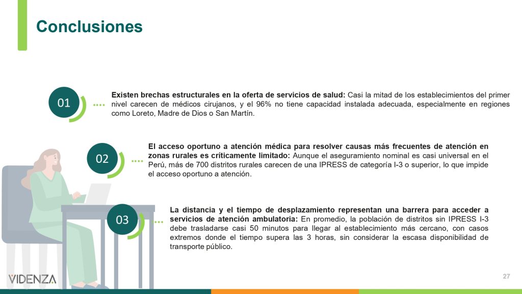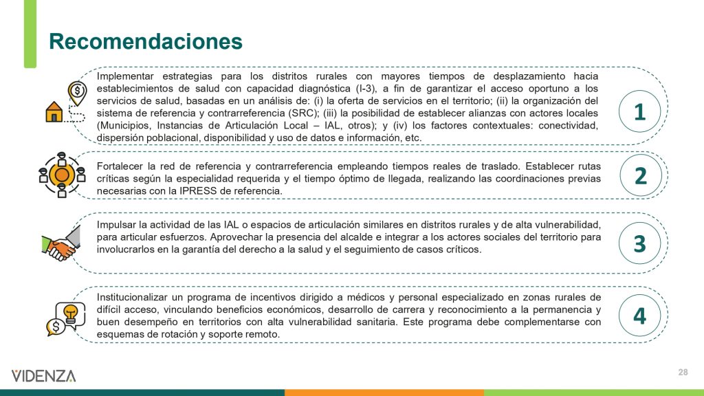El informe del Instituto Videnza propone fortalecer los centros de salud más cercanos a zonas rurales, dotándolos de laboratorios, ecógrafos y personal capacitado. También sugiere usar tecnología para que diagnósticos como radiografías puedan ser enviados a especialistas en Lima y analizados en minutos.