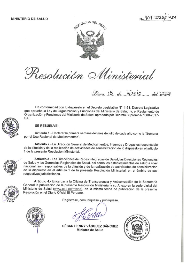 Lima, Perú. – El Ministerio de Salud (Minsa) ha declarado que, desde este año, la primera semana de julio será conocida como la “Semana por el uso racional de medicamentos”. Esta iniciativa busca que más personas conozcan la importancia de tomar medicamentos de forma segura, con receta médica y en el momento correcto.