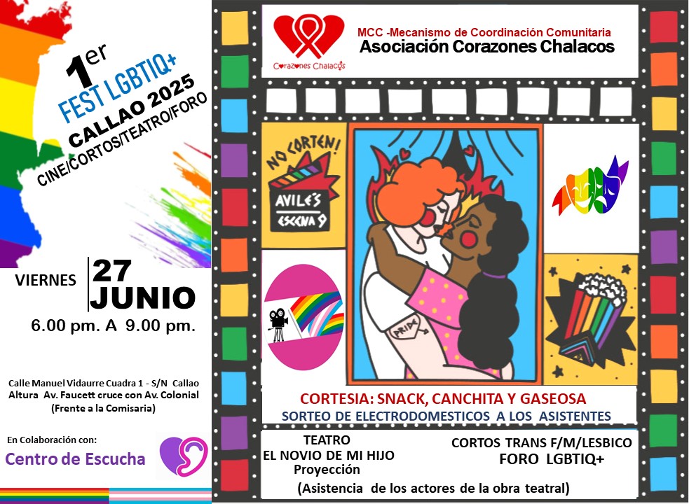 Lima – Perú.- El Callao abrirá sus puertas este viernes 27 de junio al arte y la diversidad con la realización del Primer Fest LGTBIQ+ Callao, una actividad cultural que combinará la proyección de cortometrajes, teatro audiovisual y un foro de diálogo. El evento, que se desarrollará entre las 6:00 p.m. y 9:00 p.m., se llevará a cabo en la calle Manuel Vidaurre (cuadra 1 s/n), a la altura del cruce de Faucett con Colonial, frente a la comisaría de Carmen de la Legua. Esta iniciativa es impulsada por la organización Corazón de Chalacos, con el apoyo del Centro de Escucha Callao.