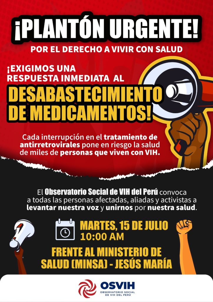 En respuesta a esta situación, el Observatorio Social de VIH del Perú (OSVIH Perú) ha convocado a un plantón ciudadano este martes 15 de julio a las 10:00 a.m. frente a la sede del Ministerio de Salud (MINSA), en Jesús María. La movilización busca visibilizar la gravedad del desabastecimiento y exigir medidas inmediatas por parte del Estado.