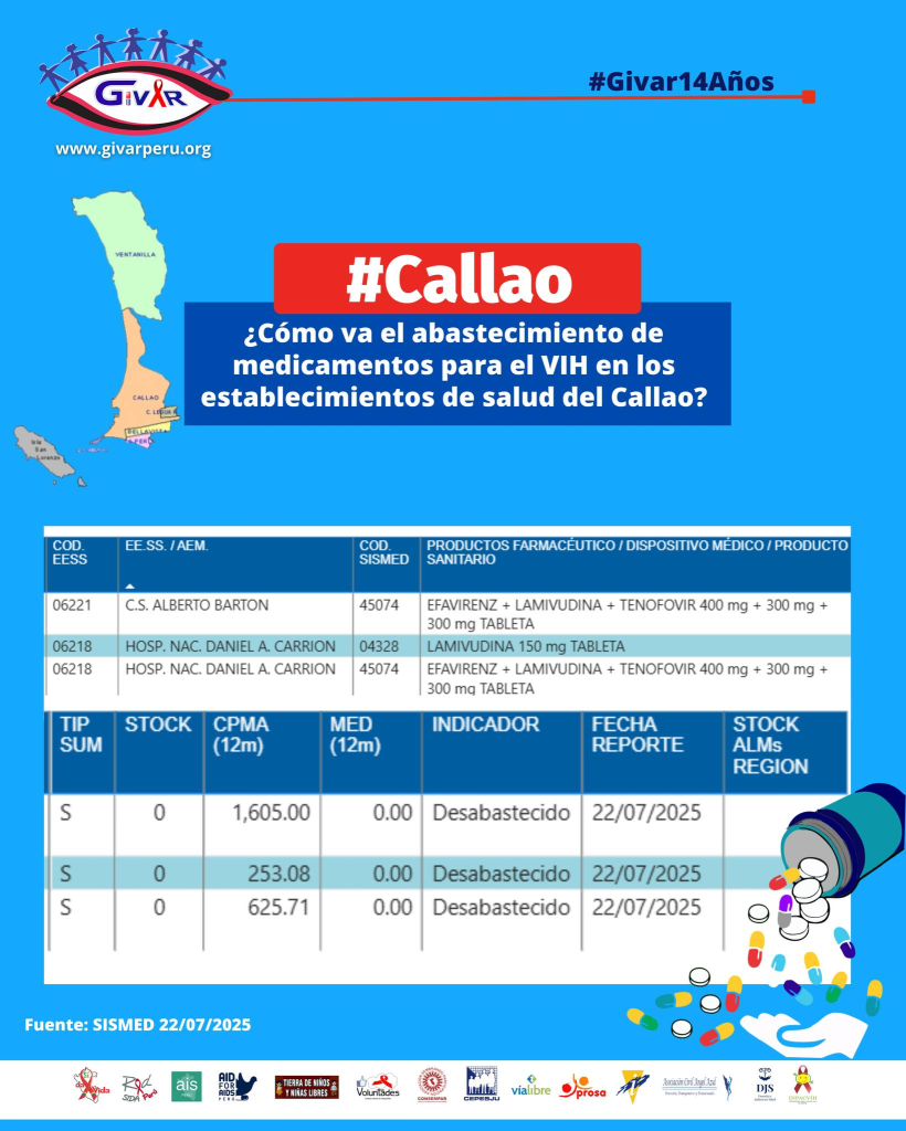 Tres medicamentos esenciales para tratar el VIH están totalmente desabastecidos en los principales establecimientos de salud del Callao. El Centro de Salud Alberto Barton y el Hospital Nacional Daniel Alcides Carrión, ambos referentes para la atención de personas que viven con VIH, han reportado cero stock de antirretrovirales al 22 de julio de 2025, según datos del Sistema Integrado de Suministro Médico (SISMED). La situación fue alertada públicamente por GIVAR Perú.