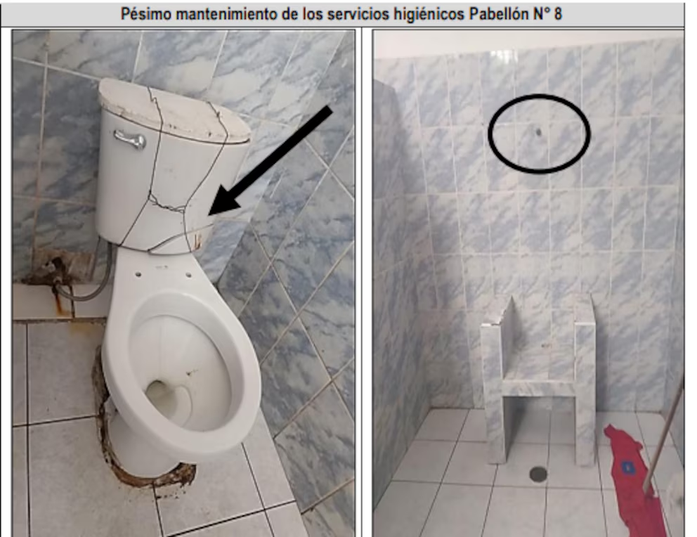 Un informe de la Contraloría (Visita de Control N.º 006-2025-OCI/0998-SVC) alerta sobre el estado crítico del Pabellón No. 8: duchas rotas, baños con moho, fugas de agua, pisos resbalosos, puertas parchadas y presencia de insectos. Esto incluye piezas faltantes, daños estructurales y falta de productos de higiene esenciales.