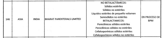 Según el Listado Único de Laboratorios Fabricantes ubicados en el Extranjero pendientes de certificación en BPM, actualizado al 28 de octubre de 2025 y remitido oficialmente por DIGEMID a la SUNAT mediante el Oficio N° 2709-2025-DIGEMID-DG-DICER-ELAB/MINSA, el laboratorio Bharat Parenterals Limited (India) figura con estado “En proceso de BPM”, es decir, aún no ha demostrado cumplir con los estándares internacionales de calidad exigidos para garantizar la seguridad y eficacia de los medicamentos