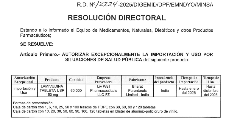 Lima, Perú.- Una reciente Resolución Directoral (R.D. N°22242025/DIGEMID/DPF/EMNDYO/MINSA) ha autorizado de manera excepcional la importación de 60 mil tabletas de Lamivudina 150 mg, un medicamento esencial para el tratamiento del VIH, fabricado por Bharat Parenterals Limited, laboratorio ubicado en India. La medida, impulsada por el Centro Nacional de Abastecimiento de Recursos Estratégicos en Salud (CENARES), busca cubrir el déficit de antirretrovirales que afecta a hospitales y centros de salud del país.